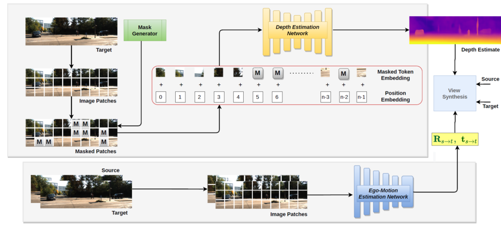 일단 학습에 사용되는 이미지는 총 3장이라고 했었죠. t-1과 t+1 시간대의 영상을 의미하는 source frame들과 t 시간대의 영상을 의미하는 target frame이 있다고 하였을 때 본 논문은 Depth Estimation network에 입력으로 사용되는 target frame 영상에 대해서만 masking을 적용합니다.