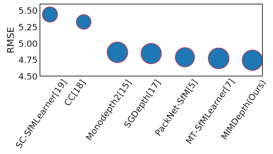 아무튼간에 저자는 y축은 RMSE에 대한 성능, scatter의 너비는 delta accuracy(값이 클수록 좋음)에 대한 것을 나타냈다고 하는데, 저런식으로 보여주면 솔직히 타 방법론과 비교해서 본 논문의 성능이 얼만큼 좋은지 어떻게 알까요.. 일단 자기들이 좋다고는 하는데 그래봤자 RMSE 소수점 0.02 정도 꼴로 매우 미미할 것이며 Depth 분야에서는 Abs_rel과 같은 다른 평가지표들도 있는데 해당 지표를 보이지 않는 것으로 보아 성능이 더 낮은 것으로 판단됩니다. 그리고 Delta에 대한 지표 역시 scatter의 너비로 표현했는데 너비가 다 똑같아 보여서 누가 더 좋다고 하기도 애매하네요.