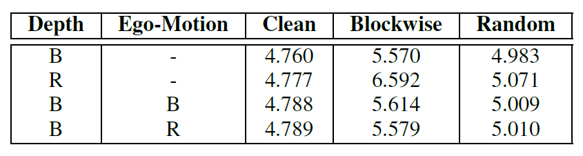 위에 표는 Depth Network와 Ego-motion Network에 대해 각각 Block-wise masking, random-masking을 어떻게 처리하는지에 대한 결과를 나타낸 것입니다. 결론부터 말씀드리면 Depth network에 대해서만 Block-wise masking을 하는 것이 가장 좋았다고 합니다. Clean에서는 사실 성능 차이가 그리 크지는 않지만 Blockwise와 같은 occlusion 환경에서 block-wise로 학습한 모델이 정량적 성능이 더 높기에 이를 채택한 것 같습니다.(사실 당연한 결과겠지요)