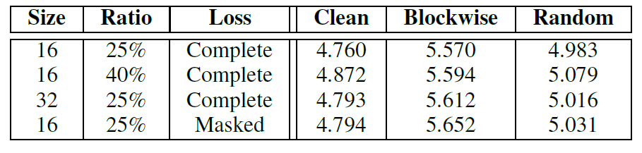 다만 blockwise와 random masking 비율에 따라 성능의 폭이 좀 커지는데 이는 random masking의 경우 밑에 정성적 그림에서도 보시면 아시겠지만 영상 전반에 걸쳐 국소적으로 나타나는 반면에, blockwise masking의 경우에는 영상 일부에 전역적으로 마스킹이 되는 것을 확인할 수 있습니다. 이러한 차이에 따라 성능 차이도 크게 발생하는 것으로 보입니다.