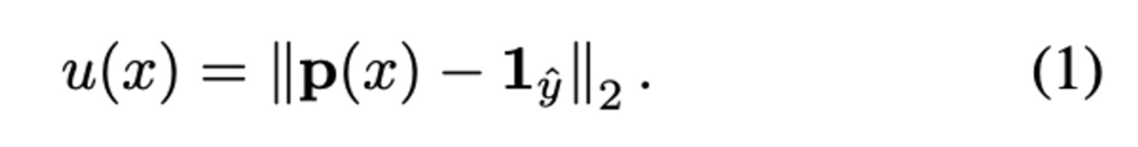 SGD를 사용하는 DNN에서는 경사 크기가 클수록 네트워크 파라미터의 업데이트 크기가 더 커질 수 있다는 연구들에 따라서, 저자는 예측값인 p(x)와 해당하는 GT one-hot vector 사이의 차이의 L2-norm인 Error L2-Norm (EL2N)을 사용하여 데이터의 기울기를 근사화하였다고 합니다. 즉, 저자는 아래 [ 수식 1 ]과 같이, 입력 이미지 x에 대한 불확실성 점수 u(x)를 \hat{y}의 원핫벡터와 p(x) 사이의 pseudo-EL2N score로 정의하였다고 합니다.