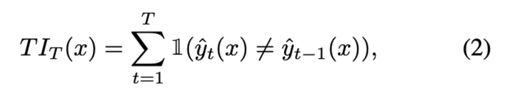 기존 연구에서도 이렇게 예측값 변화에 대한 분석을 제안한 적이 있는데요. 바로 ***catastrophic forgetting 이라는 것입니다. 다만 해당 연구는 지도학습에서의 예측값변화 및 망각 정도를 측정하기 위한 forgetting events를 제안한 것이기에, 저자의 목적에 맞게 이를 unlabeled 의 시간적 불안정성을 정량적으로 측정하고자 아래 수식 (2) 와같이 t 시점에 대한 예측값 \hat{y}_t(x)가 (t-1) 시점에 예측된 \hat{y}_{t-1}(x)과 다른 횟수를 측정하였습니다. (즉, 시간적 불안정성 측정을 위해 서로 다른 시간에 발생한 예측값이 얼마나 다른지 개수를 센 것)