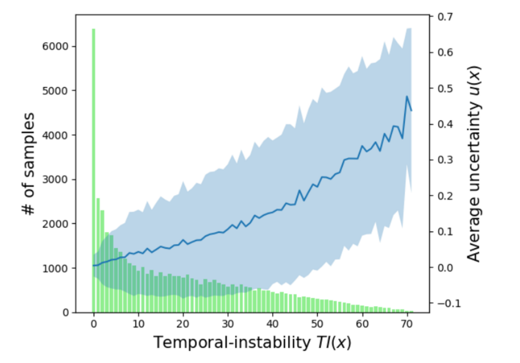 temporal instabilty는 저자가 분석한 해당 연구의 문제점 중 하나입니다. Uncertainty는 보통 예측값에 대해 계산되기에, 예측값에 대한 불확실성이라고 하기도 하는 건 아실 것 같습니다. 그런데 모델의 예측값이 시간이 지나면 어느정도 안정적으로 수렴해서 일관된 값을 발생해야하는데, 학습을 아무리 계속해도 수렴하지 않고 예측값에 변동이 크다는 것이 저자가 생각한 문제점입니다. 이를 해결하기 위한 방법을 제시한 것이라 보시면 됩니다.