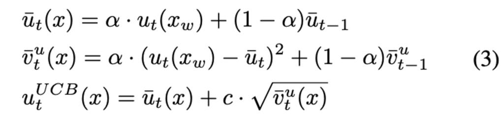 저자는 불확실성이라는 지표를 더욱 정확하게 측정하기 위해, 기존 연구들에서 사용하는 결과를 평균화하였습니다. 또한 이미 MoCo와 같은 연구에서 EMA 기법으로 동적인 업데이트를 완화하는 결과를 보인데다, 강화학습 기법인 Upper Confidence Bound(UCB)가 데이터 sampling method에 효과를 극대화하는 데에 사용되는 것을 이미 보인 연구들이 있었습니다. 따라서 이미 SSL 학습 과정에서 unlabeled 데이터에 대해 서로 다른 시간에 대해 예측값도 다양하게 얻을 수 있습니다. 그렇기 때문에 저자는 unlabeled mini batch의 불확실성을 측정한 뒤 EMA 기법을 통해 UCB를 계산하였습ㄴ디ㅏ. 이 때, 시간 t에서 unlabeled sample x의 불확실성은 weakly augmentation 이미지 p(x_w)를 사용하여 계산하였으며, 불확실성의 EMA와 UCB의 수식은 다음 [ 수식 3 ] 에서 확인할 수 있습니다.