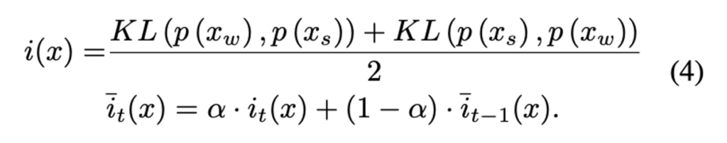 데이터가 얼마나 일치하지 않느지를 측정하기 위해 불확싱성 u(x)와 마찬가지로 아래 [ 수식 4 ] 와 같이 KL-divergence를 사용하여 학습 단계에서의 unlabeled smaple에 대한 weakly, strong augmentation 이미지 사이의 불일치를 측정한 뒤, EMA 를 적용한 것이 아래 수식 \bar{i}_t(x)와 같습니다. (즉, 두 이미지가 다를 수록 데이터 일관성은 더욱 작아지겠죠)