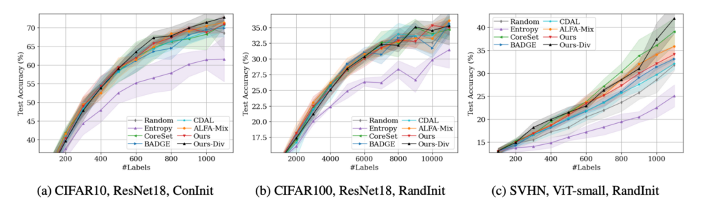 비교를 위해, 랜덤샘플링, Entropy, BADGE, CDAL, CoreSet, ALFA-Mix 를 사용하였습니다. 데이터셋은 ALFA-Mix와 동일하게 CIFAR-10, CIFAR-100, SVHN, MiniImageNet 을 사용하였습니다. 추가로 저자의 아키텍처가 다른 아키텍처에서도 작동하는지 실험해보기 위해 CIFA-10과 SVHN과 같은 작은 데이터셋에서는 VIT=small 을 백본으로 사용한 실험 결과를 리포팅 하였습니다.