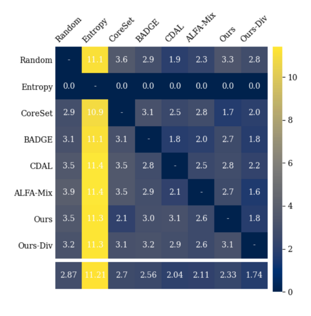 아래 그림에서 보이듯, 4개의 데이터셋과 2개의 모델을 조합한 경우 ‘Ours-Div’가 가장 좋은 성능을 보였다고 합니다. 추가로 1:1로 모델을 비교하기 위한 상관관계 매트릭스도 아래 그림 에서 확인이 가능하며, SOTA와 비슷한 성능을 보일 수 있었다고 합니다.