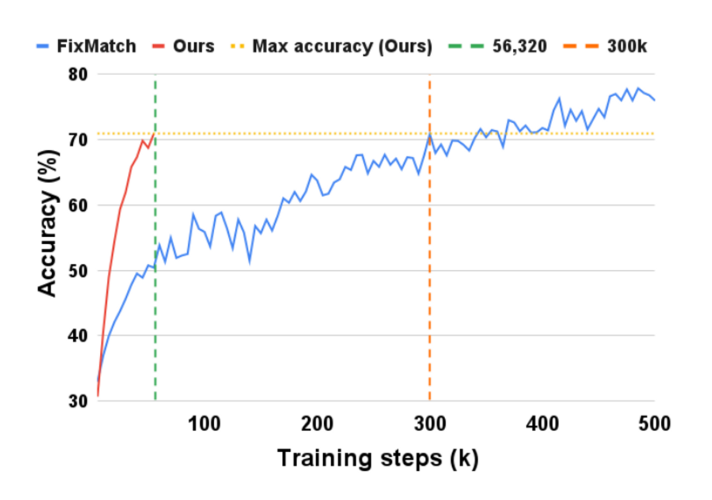 학습 시간 측면에서 제안한 방법을 FixMatch와 비교하였느데요. 10라운드까지 총 학습 step은 56,320개로, 이는 500,000개의 학습 step 중 약 11%에 해당합니다. 아래 그림 7은 훈련 중 FixMatch와 저자가 제안하는 방법론의 testset에 대한 정확도를 비교한 것입니다. Resnet-18 모델에 CIFAR-10을 적용한 결과, FixMatch는 30만 학습 step에서 70.82%를 달성하며, 약 5만 6천 학습 step에서 저자의 방법이 얻은 70.90%에 가장 근접한 결과를 보였습니다. 특히 이 경우에는 저자가 제안한 방식이 SSL보다 약 5.3배 빠르다는 결과를 보일 수 있었습니다.