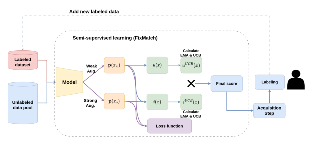 아래 글미이 저자가 제안하는 ASSL의 최종 파이프라인입니다. 결국 FixMatch와 Active Learning 을 결합할 때, EMA를 사용하여 모델의 업데이트를 조금 느리게 하고자 하였고, 다음으로 Loss Function까지 재설계를 하였다고 결론을 내릴 수 있을 것 같습니다. 그리고 Active LEarnign의 베이스로는 ALFAMix를 사용한 듯 싶습니다.