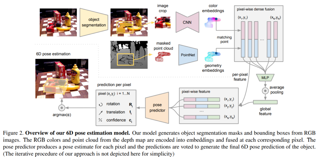 저자들은 global fusion 대신 픽셀단위의 local fusion 방식을 통해 물체의 보이는 영역을 기반으로 pose를 예측하도록 하여 global fusion 방식의 문제인 occlusion 영역과 잘못된 segmentation 결과로 인한 노이즈 영향을 최소화 할 수 있다고 합니다.