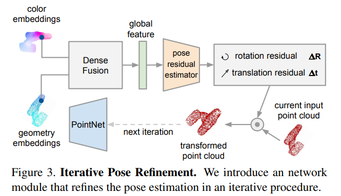 기존 방법론들이 많이 사용하던 ICP(iterative closest point) 알고리즘은 refinement에 효과적이지만, real-time으로 작동하는 것을 어렵게 하는 경우가 많다고 합니다.(아무래도 최적의 값을 찾기 위해 반복적으로 이를 수행하므로 시간이 오래 걸립니다.) 또 다른 refinement 방식은 실시간 렌더링이 가능한 엔진과 object 모델을 이용하는 방식이 있으며, 본 논문에서는 추가적인 렌더링 기술 없이, 최종 pose를 개선할 수 있는 네트워크 기반의 iterative refinement 모듈을 제안합니다.