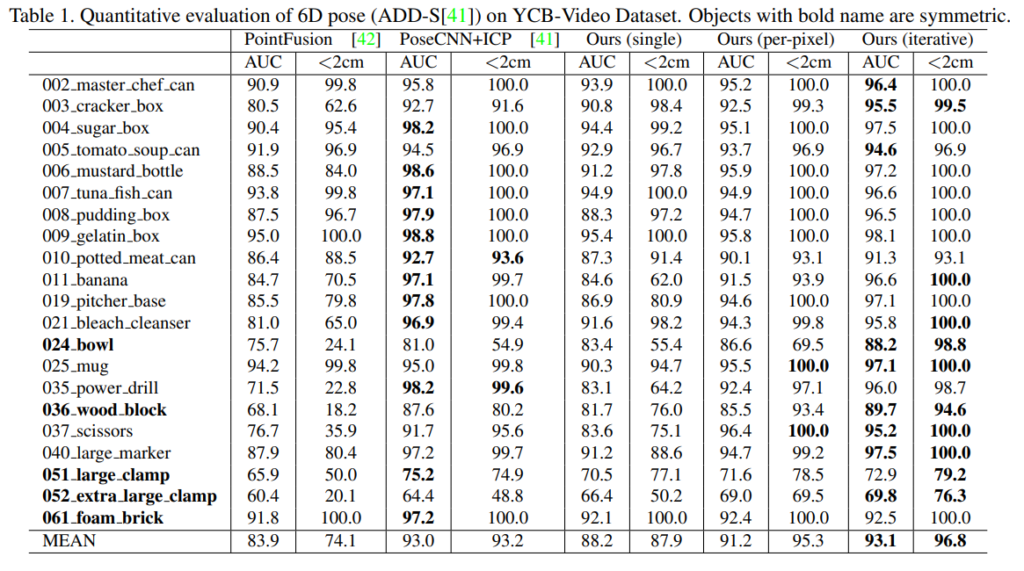 Table 1은 YCB-Video에서의 21개 객체에 대한 평가 결과로, 다른 방법론들과 비교했을 때 저자들이 제안한 방식(+refinement)이 가장 좋은 성능을 나타냈다고 합니다. AUC에서는 미세한 성능 향상이 나타나지만, <2cm에서는 PoseCNN+ICP 방식보다 3.5% 더 좋은 성능을 보였습니다.