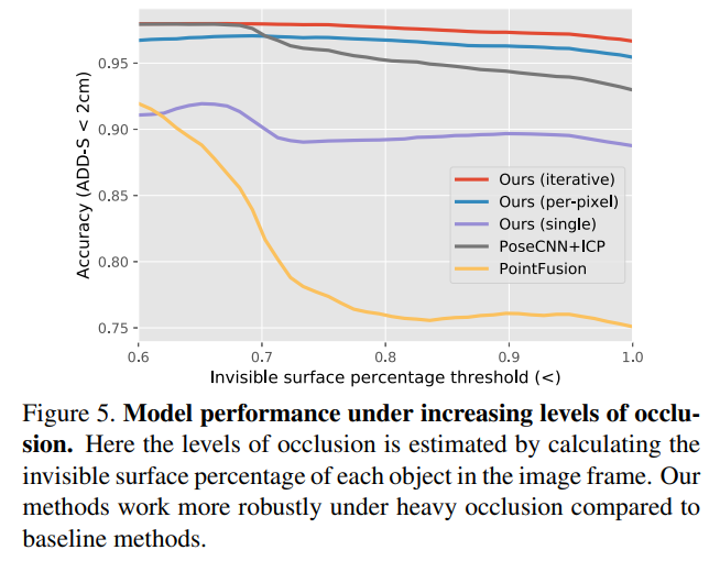 Figure 5는 (2)에 대한 실험 결과로, 저자들이 주장한 dense fusion 방식의 장점인 occlusion과 segmentation 오류에도 강인함을 정량적으로 확인하고자 각 object의 보이는 영역의 비율을 계산한 뒤, occlusion 정도에 따라 어떻게 변하는 지 확인한 결과입니다. 저자들이 제안한 방식이 invisible 영역이 증가함에도 성능이 크게 저하되지 않는 것을 호 ㅏㄱ인할 수 있습니다.