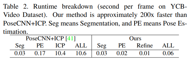 Table2는 시간의 효율을 확인하기 위해 PoseCNN+ICP 방식과 비교한 결과로, 저자들이 제안한 방법론이 2배 이상 빠르고, 특히 ICP(refinement 과정)에서 크게 효율이 좋아진 것을 확인할 수 있습니다.