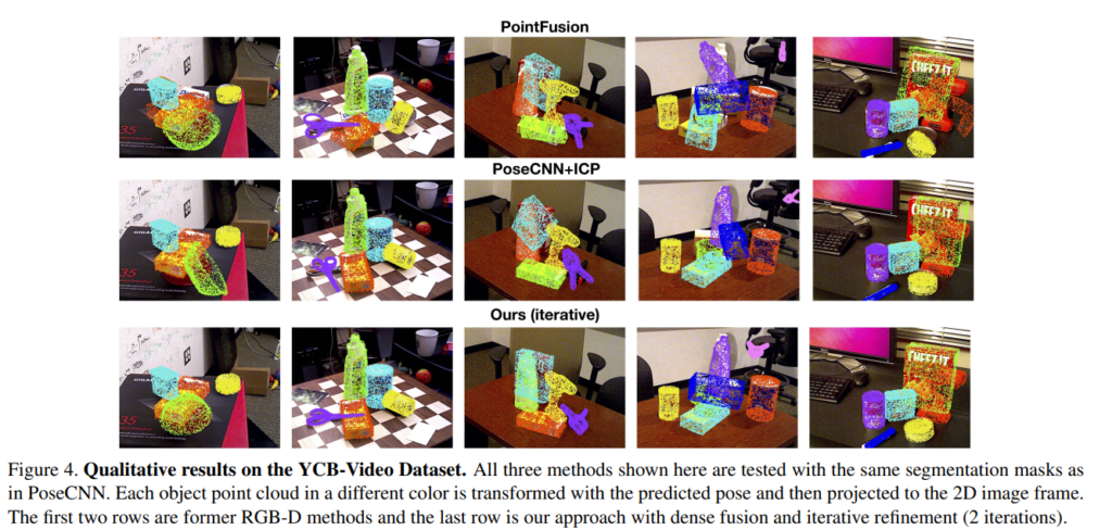 저자들은 실험을 통해 (1) dense fusion network가 global fusion 방식과 비교하였을 때 어떤지, (2) dense fusion이 occlusion과 segmentation 오류에 얼마나 강한지, (3) 반복적인 refinement 모듈이 pose를 개선할 수 있는 지, (4) 저자들이 제안한 방식이 실제 활용 측면에서 효율적인지를 확인하고자 한다고 합니다.