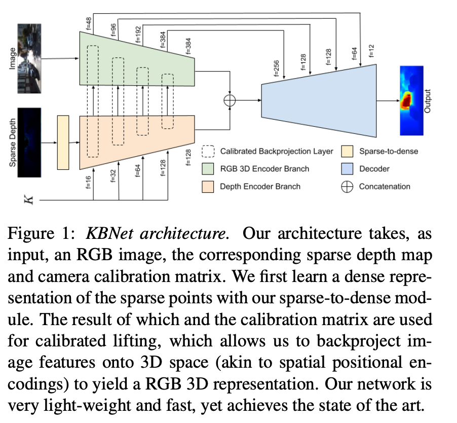 해당 태스크는 이미지 평면 수준의 조밀한 깊이 정보를 GT인 조밀한 깊이 정보 없이 RGB 영상 I 과 sparse point cloud z 를 이용하여 복원하는 것을 목표로 합니다. 이를 수행하기 위해 저자는 크게 2가지 모듈, sparse-to-dense (S2D) f_{\omega} 와 calibrated backprojection (KB) layers을 제안합니다. S2D는 여러 크기의 커널을 가진 min과 max 풀링으로 구성되어 있으며, 이를 통해 희소한 깊이 정보의 로컬 및 글로벌 구조를 살리며, 조밀한 깊이 정보의 초기화를 수행하는 역할를 합니다. KB layers는 내부 카메라 파라미터를 이용하여 2차원에 투영된 정보들을 명시적으로 3차원 공간에 backprojection을 수행하여 정보를 보정합니다. 영상 정보와 희소한 깊이 정보의 두 스트림을 가진 이전 작업과들은 달리 내부 카메라 파라미터를 입력으로 받는 KB layer를 통해 이미지 영역의 정보를 3차원 공간으로 끌어올려 해당 정보를 조밀한 3차원 정보를 복원하는 decoder에 skip connection을 통해 전달합니다. 해당 모델은 비지도 학습을 수행하기 위해 시간적으로 인접한 영상 프레임을 이용한 손실 함수를 설계하여 학습을 수행합니다. 해당 KBNet의 도식화는 fig 1을 참고하시면 됩니다.