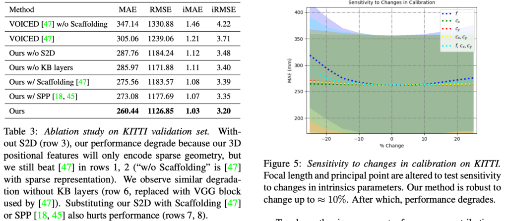 fig 5는 캘리브레이션 정보가 주는 영향에 대한 실험입니다. 해당 모델은 캘리브레이션 정보를 입력으로 받아 수행하기 때문에 강인성에 대한 실험을 위해 진행된 걸로 판단됩니다. 또한 다른 depth completion 방법론의 캘리브레이션 정보의 영향력에 대한 통찰을 줄 수 있는 실험으로 보입니다. 결과적으로 focal length이 줄어들었을 때, 성능에 가장 큰 영향을 줍니다. 알고리즘의 특성상 focal 값이 줄어들면 먼 거리의 정보들에 대한 공간이 줄어들어 손해가 발생합니다. 더 올라가는 경우에는 덜 영향을 준다고 분석되어집니다.