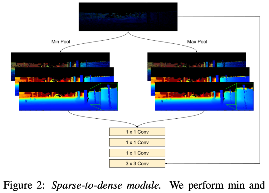 S2D module f_{\omega} 는 다양한 커널 크기를 가진 min and max pooling을 이용하여 희소한 깊이 정보 z에 대해 다중 스케일 고밀도화를 수행하는 역할을 합니다. (커널 크기는 sparse point cloud를 추론하는 센서 혹은 방법에 의한 희소성에 따라 조절한다고 합니다) 여러 스케일과 두 가지 방식의 풀링 레이어를 통해 출력된 정보들 간의 trade off를 학습하기 위해 3개의 1×1 conv에 입력되어 집니다. 이후 3×3 conv를 통해 z와 융합되어 이후 네트워크에 고밀도 혹은 준고밀도 깊이 특징을 생성합니다.