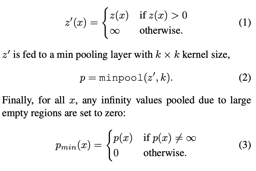 추가로 희소한 깊이 정보의 0 또는 음수 형태의 깊이 값을 풀링하지 않도록 수행하는 최소 풀링 레이어를 설계합니다. 이는 다음과 같습니다.