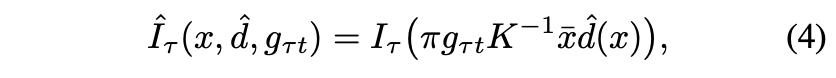 여기서 \bar{x} 는 homogeneou coordinate의 x에 해당하며, g_{\tau t} \in SE(3)는 인접 프레임 간의 상대적 포즈 정보에 해당합니다. K는 내부 캘리브레이션 매트릭스에 해당합니다. \pi 는 perspective projection에 해당합니다.
