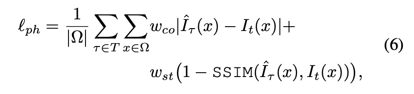 Photometric Consistency. 위에서 언급한 비지도 기반의 방법인 수식 4를 통해 인접한 영상 프레임들을 재구성하여 photometric reprojection error를 활용합니다. 저자는 L1과 SSIM을 이용하여 복원 유사성에 대한 정도를 측정합니다.
