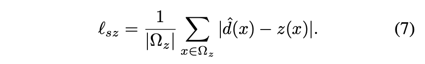 Sparse Depth Consisten. 깊이 수준에서의 스케일을 예측하기 위해 spare point \omega_z 에 대한 L1 Loss를 수행합니다.