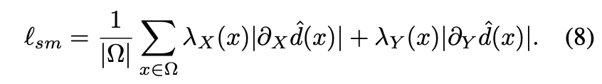 Local Smoothness. 예측된 조밀한 깊이 정보에 대한 local smoothness와 연결성을 강화하기 위해 영상 정보의 수직 수평 측면의 그래디언트를 활용한 손실 함수를 사용합니다.