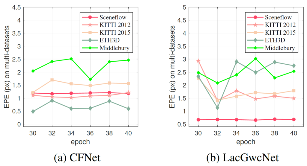 반면에 이렇게 학습된 모델을 KITTI2012부터 Middlebury까지 4가지 데이터 셋에 대해서 평가할 때, 특정 에포크 수(예를들어 LacGwcNet의 경우 32에포크에서 학습한 체크포인트가 Middlebury와 KITTI, ETH3D 데이터 셋에서 가장 적은 에러값을 가지고 있음.)에 상당히 좋은 성능을 보여주는 반면 또 다른 에포크에서는 상대적으로 좋지 못한 성능을 보여주고 있다는 점입니다.