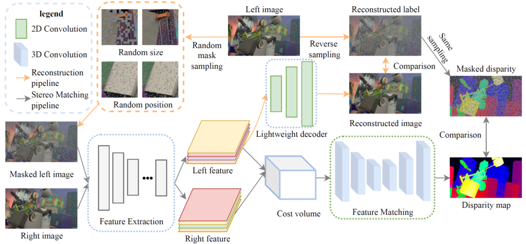 결과적으로 이렇게 마스킹 과정을 왼쪽 영상에 적용하게 된 후, 왼쪽 영상과 오른쪽 영상 각각 shared Feature Extractor를 통과시켜 Feature map을 추출합니다. 추출된 Feature map에 대하여 두 영상의 feature map은 Cost Volume을 만들거나 혹은 Left feature에 한해서 simple decoder를 타고 이미지 복원을 수행하게 됩니다.