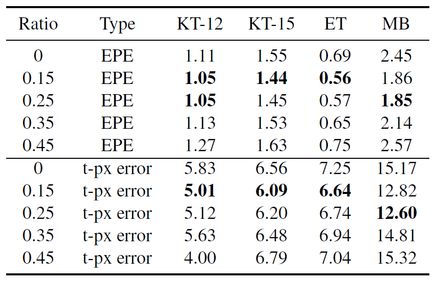 그럼 masking ratio에 대한 ablation study부터 살펴보시죠. 전반적으로 보면 EPE도 그렇고, t-px error도 그렇고 작은 크기의 masking ratio 값을 가져야 좋은 generalization performance를 보여주는 것을 확인하실 수 있습니다.