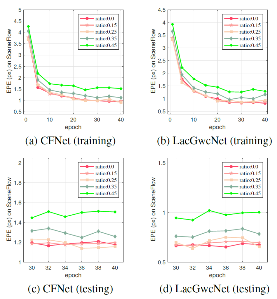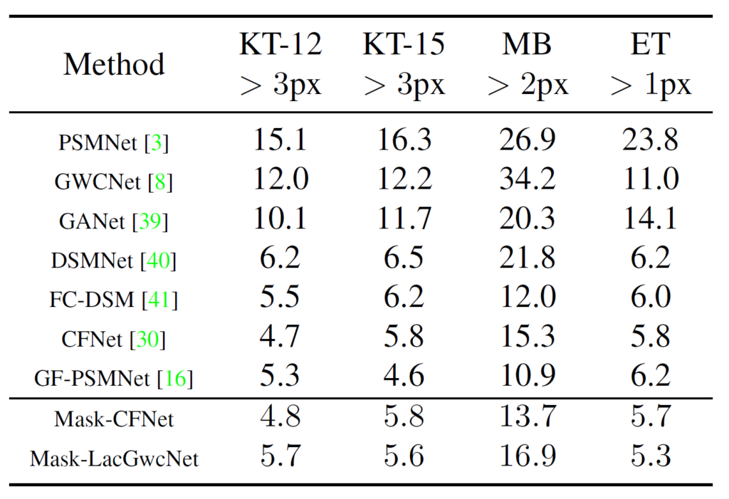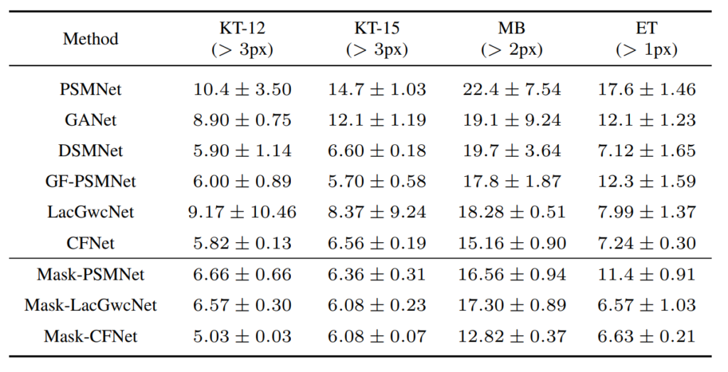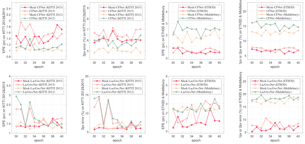 실제로 위에 표는 본 논문 supplemental material에서 가져온 것으로 CFNet과 LacGwcNet의 평균 값보다 Mask를 적용하였을 때의 평균 성능이 더 좋은 것을 확인할 수 있었습니다. 게다가 LacGwcNet의 경우에는 KITTI 데이터 셋에서 에포크에 따른 편차가 상당히 크게 나타나있네요.