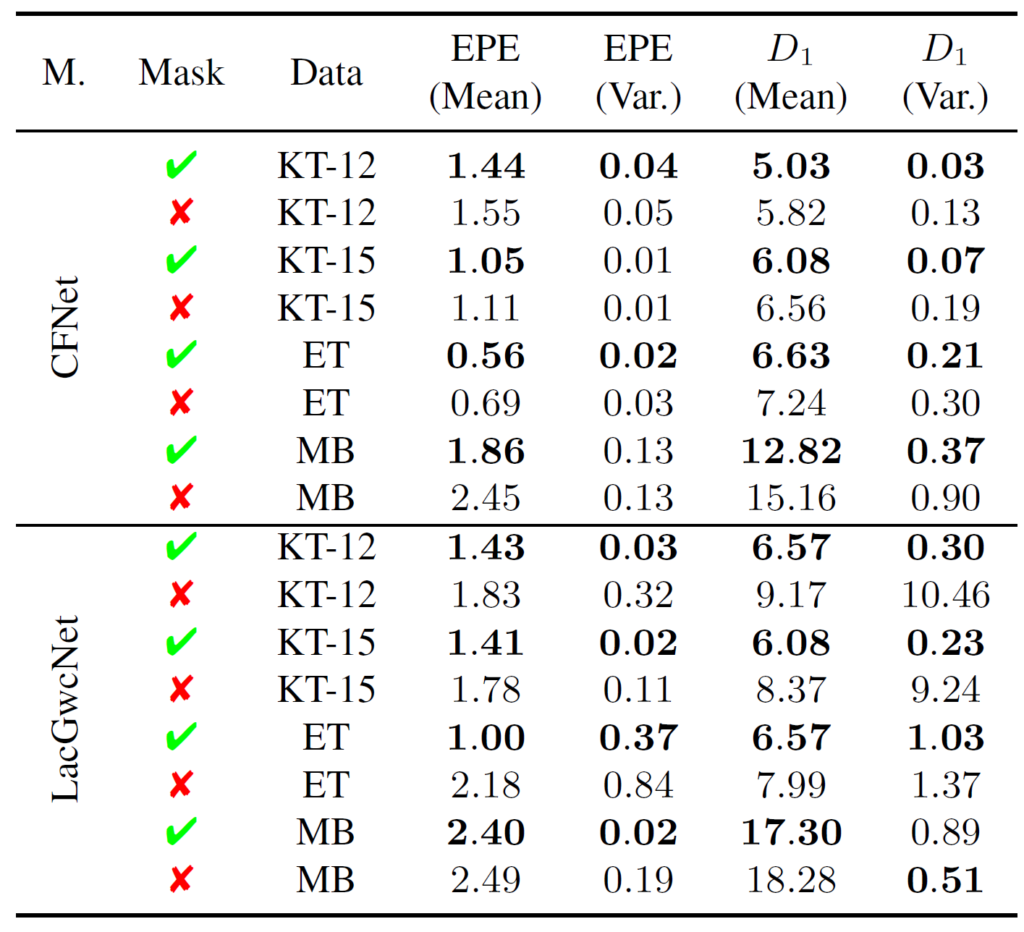 위에 표를 살펴보시면 Mask를 적용한 경우 평균적으로 EPE와 D1의 값이 더 작은 것을 볼 수 있네요. 그리고 variance에 한해서도 더 적은 값을 가지는 것을 확인하실 수 있습니다.(CFNet의 EPE 평가 지표를 제외하구 말이죠.)