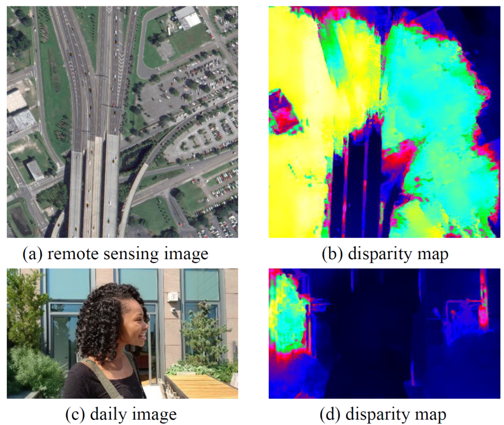 이에 대해 더 구체적으로, 논문에서는 자신들이 제안한 학습 방식으로 학습된 모델의 진정한 Domain Generalization performance를 계산하기 위해서, 위성 사진과 일상의 사진 등을 평가해보았습니다. 그 결과는 아래 그림과 같은데, 한눈에 보더라도 disparity map 계산이 실패한 것으로 보이죠.