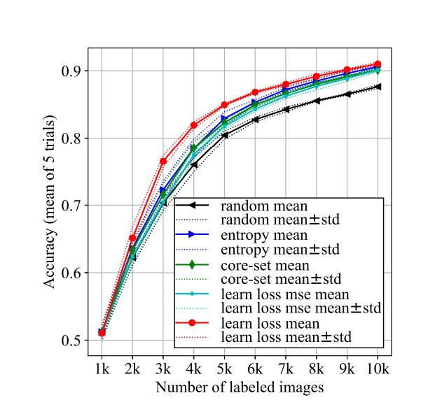 뿐만아니라, 현재 Active Learning 은 방법론마다 “초기에 라벨링하는 데이터셋에 따라서도 성능 차이가 크”게 발생하는 상황입니다. 같은 CIFAR-10에 포함되는 데이터라고 해도 선택한 하위 데이터셋의 크기와 구성 이미지들에 따라 성능이 천차만별입니다. 그렇기 때문에 분명 A라는 논문에서 자신의 방법론이 SOTA라고 주장할지언정 B라는 논문에서 다른 하위데이터셋으로 Active Learning을 수행햇을 때 전혀 다른 성능이 리포팅되는 상황이라.. 명확하게 SOTA라고 말할 수 있는 방법론도 없는 상황입니다.