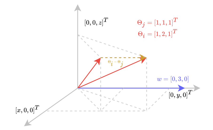 3차원 벡터 공간에서 \theta_i = [1, 2, 1]^T, \theta_j = [1, 1, 1]^T, w = [0, 3, 0]이 있습니다. (이 때, LLoss 와 동일하게마진으로는 1을 사용합니다) 실제 loss l_i, l_j 에 따라 loss는 두 가지 경우로 나누어지는데, 이는 LLoss 수식 (2)과 같이 [1] l_i > l_j [2] l_i < l_j 인 경우로 나뉘게 됩니다. 우선 [1]에 따라 L_{loss}에 \theta_i, \theta_j, w를 대입하면: L_{loss} = max(0, -1*(6-3)+1) = 0 이 됩니다.