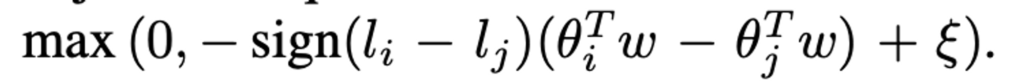 우선 실제 GT loss인 l_i, l_j가 있을 때, l_i > l_j 일 경우 pred_loss 역시 \hat{l_i} > \hat{l_j} 여야 합니다. 그래서 저자는 그런 경우가 아닌 그 반대 상황일 때 loss가 발생하도록 설계를 하였습니다. 정리하자면 margin을 사용한 Ranking loss 라고 할 수 있으며 수식 2가 지금까지 제가 설명한 내용이라고 할 수 있습니다.