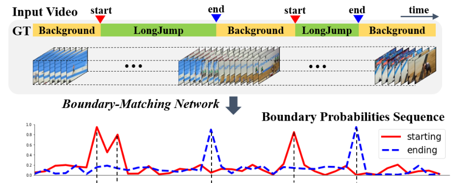 한편, 이 논문에 영향을 준 Boundary-Sensitive Network (BSN)에서는 “bottom-up” 방식의 proposal 생성을 적용했습니다. 이는 시간적 경계(temporal boundary)를 정의하고 이를 조합하여 proposal을 생성하는 방법입니다. 사전에 존재하는 sliding window의 길이에 맞추어 proposal이 생성되는 것이 아니라, 어떤 액션의 시작점과 끝점을 찾고, 이들을 합쳐 proposal을 생성하므로 앞선 방법에 비해 더욱 다양한 길이의 정교한 proposal을 생성할 수 있습니다.