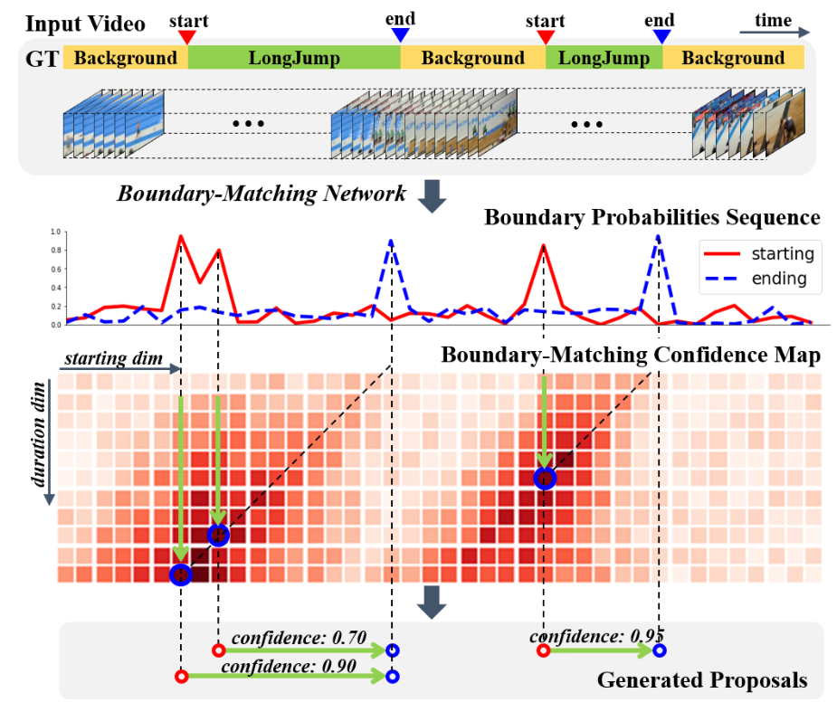 그림에 나타난 것처럼 TEM이 생성한 boundary 확률과 PEM이 생성한 BM confidence map을 함께 활용하면 쉽게 proposal과 confidence를 생성할 수 있습니다.