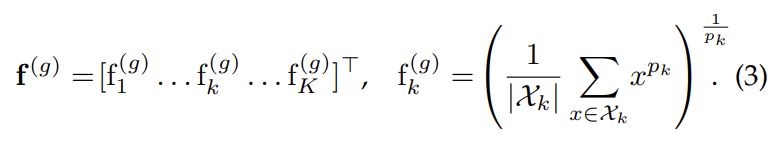 [그림 1] 상단의 GeM discriptor에서 저자들이 새롭게 제안하는 부분은 Generalized mean pooling 레이어로 수식으로 표현하면 아래의 수식(3)과 같습니다.