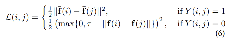 network의 학습에 사용된 loss는 contrastive loss로 두 query와 sample간의 matching 관계를 고려하였습니다. 앞서 리뷰했던 NetVLAD, R-MAC등 다른 retrieval의 training 방식을 살펴보면 [query, positive/negative]와 같이 두 이미지가 pair하게 구성되는 것을 알 수 있습니다. 여기서도 training input이 두 이미지 (i, j)로 구성되며, 이 이미지 쌍의 관계에 따라 label Y가 추가되어 최종 loss는 아래의 식(6)과 같이 사용되었습니다.
