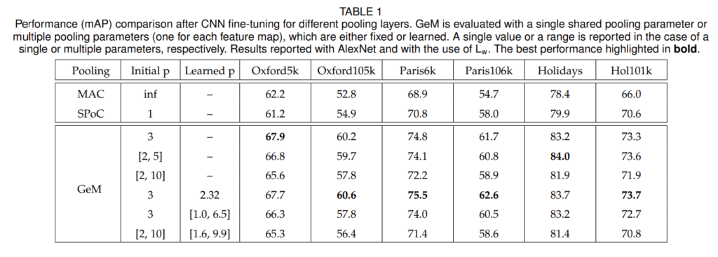 [표1]은 pooling layer에 따른 retrieval 성능으로 전반적인 task에서 기존 방법론에 비해 GeM레이어가 높은 성능을 달성한 것을 확인할 수 있습니다. 특히 GeM은 pooling 파라미터 p에 따른 실험 결과를 리포팅하였는데, 크게 파라미터의 고정 유무와 siamese network간의 share 여부를 비교하여 실험을 진행하였습니다. 결과에서 learned p가 존재하지 않는 실험은 고정된 initial p 값을 사용하여 pooling을 진행한 것이고, p값이 두 개 존재하는 실험은 siamese network에서 각각 추출된 두 feature map에 별개의 p값을 사용한 것입니다. [표1]을 다시 살펴보자면, shared 파라미터를 사용하는 것이 multiple 파라미터를 사용한 경우보다 높은 성능을 보이는 것을 확인 할 수 있습니다. 이는 별개의 파라미터를 사용함으로 인해 보다 복잡한 cost 함수를 사용하기 때문입니다.