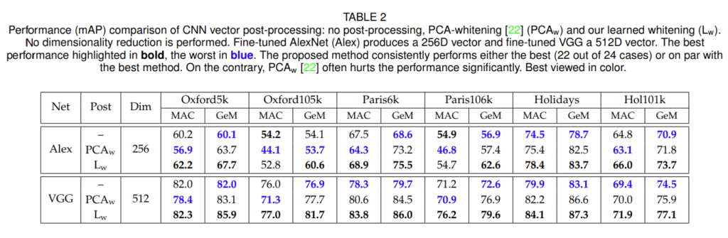 [표2]는 PCA-whitening의 우뮤에 따른 성능으로 각각 non-whitening, PCA-whitening, learned PCA-whitening을 비교하였습니다. 보시면 모든 벤치마크에서 GeM+Learned PCA를 사용한 것이 가장 좋은 결과를 보이는 것을 확인할 수 있습니다.