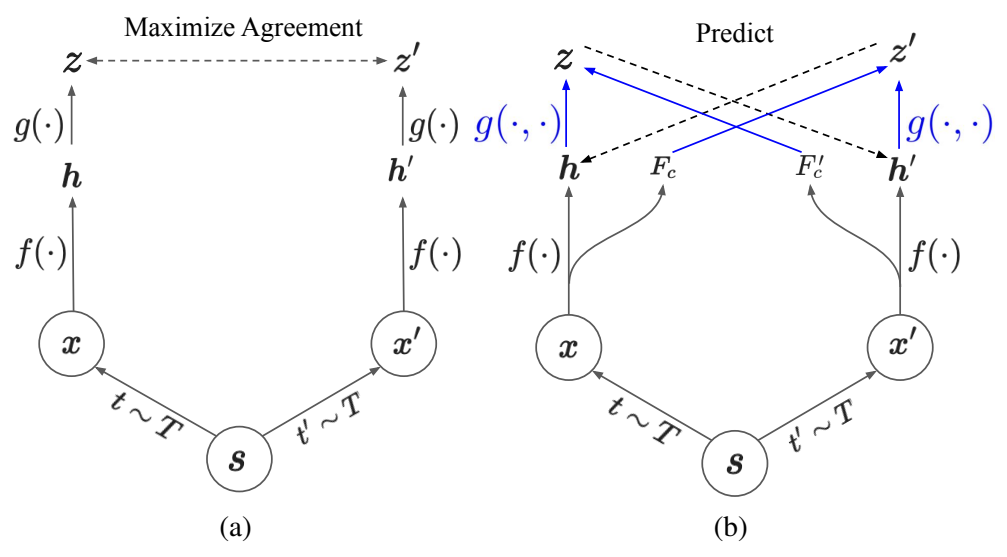 이러한 상황에서 논문 저자는 Contextualized Spatio-Temporal Contrastive Learning(ConST-CL)을 제안하는데요. 이 방법론이 위의 (b)번 그림에 해당합니다. 이 방식은 Global contrastive objective를 통해 spatio-temporal 일관성을 강제하는 학습 방식의 단점을 우회하면서, spatio-temporal한 특성을 배우는 방식입니다. (강제하는 방식의 예시가 딱히 없는데 아마도 global feature를 따로 만들어서 학습하는 방식들이거나, 비디오를 표현하는 feature를 이용해서 학습하는 방식들을 말하는 것 같네요) 이를 우회하기 위해서 기존의 방식과 다르게 projection function g(\cdot, \cdot)을 이용해서 instance feature만을 다루는 것이 아니라 context feature도 고려할 수 있도록 함수를 설계했다고 하네요.