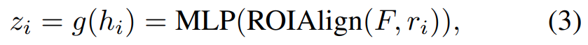 이 좌표에 접근하는 방식은 Faster-RCNN의 ROIAlign을 사용해서 feature를 가져옵니다. 수식으로는 [수식 3]과 같이 구성되어 있고, 좌표 자체는 r = \{t, x_{min}, y_{min}, x_{max}, y_{max}\}입니다.