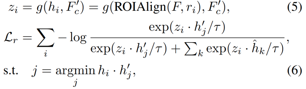 수식으로는 위의 두 수식인데요. “Region-Based Contrastive Learning in Videos”와 유사한 형식이지만 크게 보면 [수식 5]에서 입력이 두가지가 되었습니다. 이는 이 모듈이 복원 관점에서 작동해야하기 때문에 그러한데요. ROIAlign(F,r_i)는 source view의 특정 박스를 의미하고, F_c^{'}는 이제 target view의 context feature를 뜻합니다.