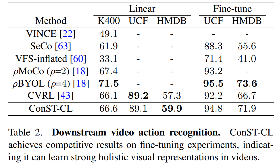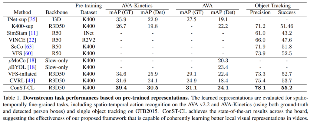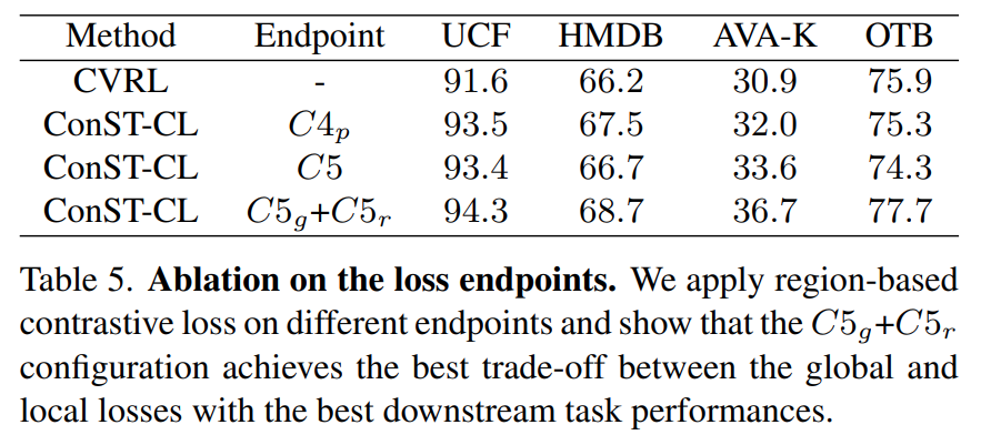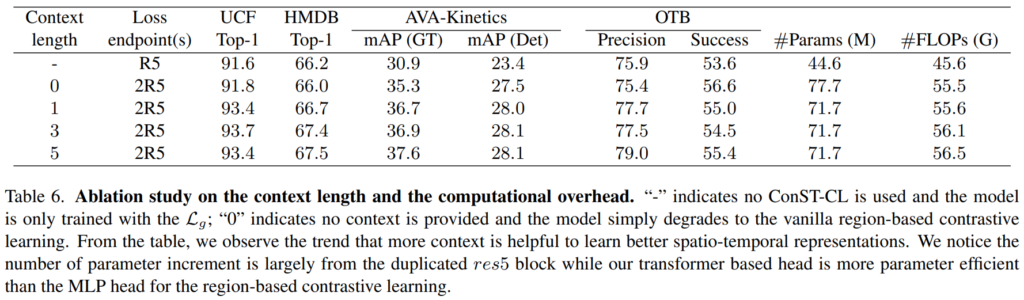 실제로 이 조합에 대한 실험 결과가 [표 5]에 위치하는데요. 모델의 레이어 추가로 인하여 약간의 코스트 증가가 있긴 하지만, 기본적으로 AVA-K와 OTB와 같은 downstream task에서 성능이 꽤 오르는 것을 볼 수 있습니다.