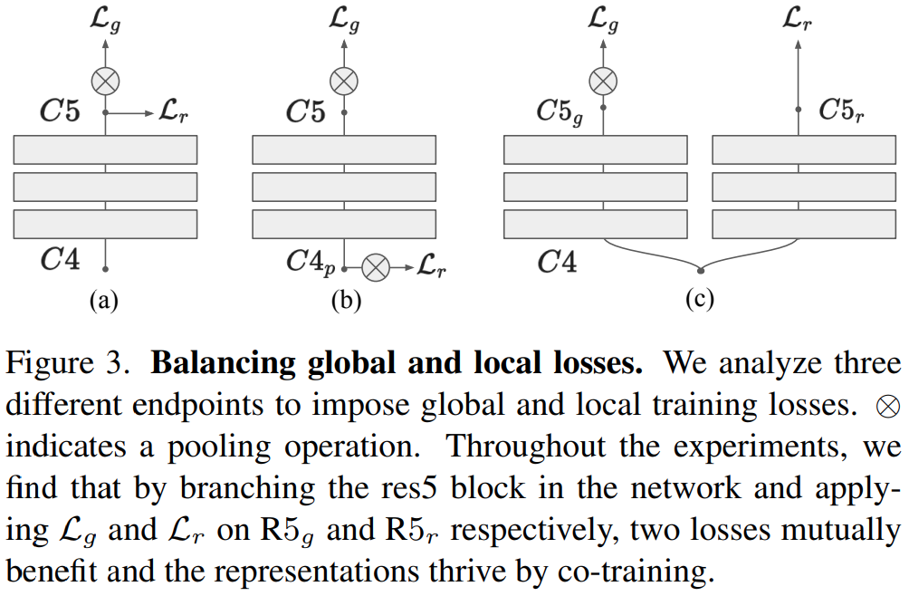 이 논문에서는 이러한 발견을 적용하기 위해서 백본으로 사용하는 ResNet3D-50 구조를 수정합니다. C5의 끝부분에 local loss를 추가하는 방식이 이 방식인데요. Average pooling이 수행되기 전에 loss를 계산하는 것이 핵심입니다. 이 방식은 [그림 3]의 (c)의 형태로 수정이 되었는데요. 보면 알겠지만 마지막 res5 블록을 복제해서 한쪽은 global loss를 계산하고, 한쪽은 local loss를 계산하는 것을 볼 수 있습니다.