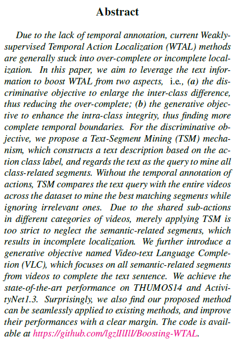 - To best of our knowledge, we are the first to leverage text information to boost WTAL. We also prove that our method can be applied to existing methods.
