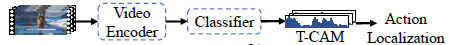 위 그림을 통해 기존 WTAL 방법론들의 파이프라인을 알 수 있습니다. Raw video를 받아 I3D 등의 3D backbone network로 인코딩을 수행하고, 여러 개의 1D Conv 연산을 통해 T-CAM을 얻게 됩니다. 이 과정에서 실제 action 구간에 대한 label은 없지만 T-CAM이 최대한 실제 action 구간과 유사한 예측을 만들어내도록 각 방법론마다 다양한 장치들이 설계되는 것입니다.