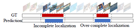Action completeness 문제에는 위 그림에서 볼 수 있듯 incomplete와 over-complete localization이 포함됩니다. Incomplete localization은 실제 action 구간에 비해 모델이 예측한 action 구간이 앞뒤로 좁은 경우이고, over-complete localization은 그 반대의 경우를 뜻합니다.